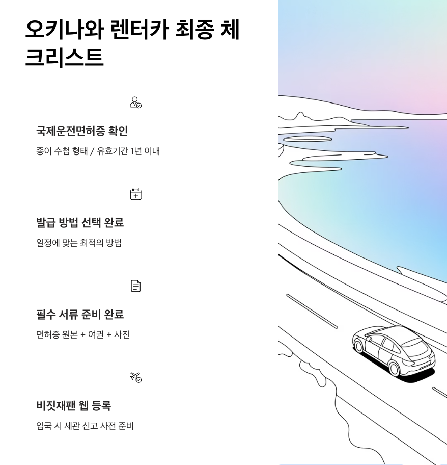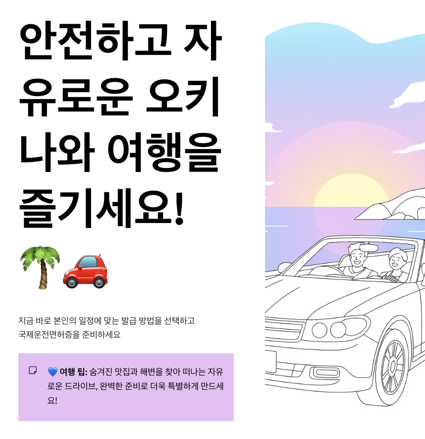 지금 바로 본인의 일정에 맞는 발급 방법을 선택하고 국제운전면허증을 준비하세요! 여러분의 안전하고 즐거운 오키나와 여행을 응원합니다.