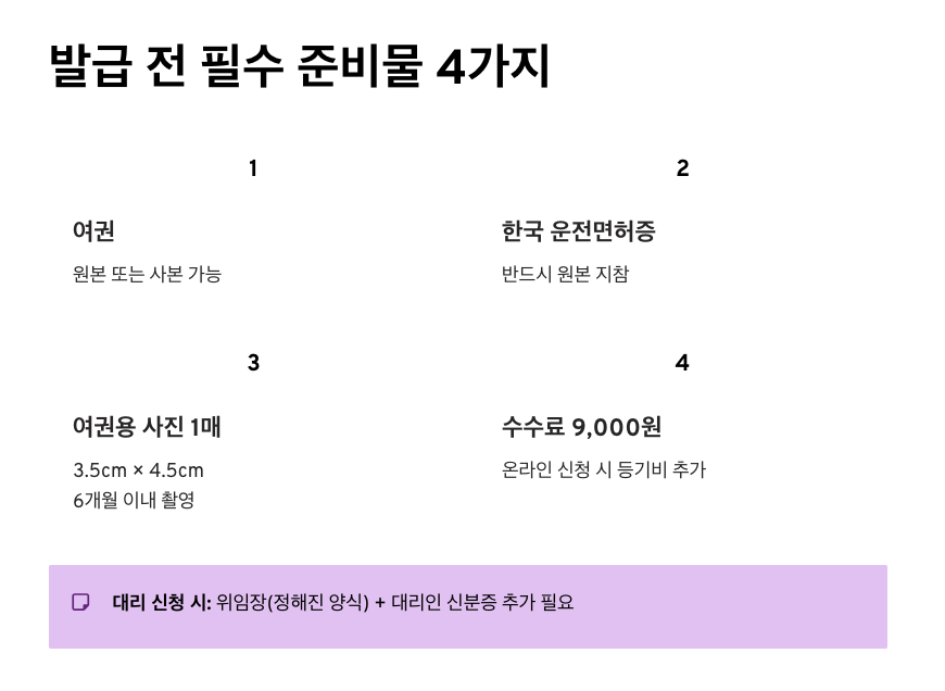 - 필수 서류 지참: 운전면허증 원본, 여권, 여권용 사진을 빠짐없이 준비했는가?