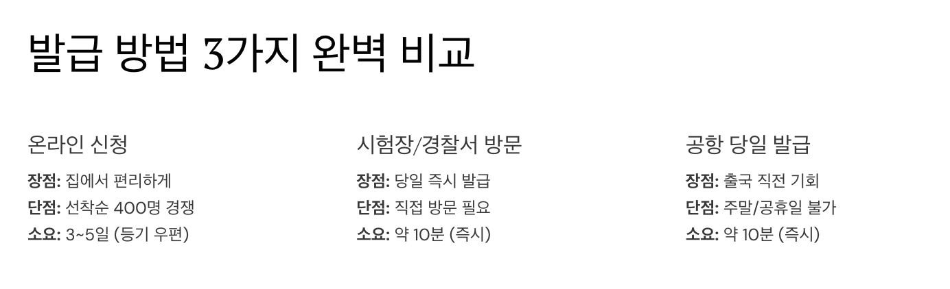 | 2. 운전면허시험장/경찰서 방문 | 신청 당일 즉시 발급 가능 | 직접 방문 필요, 운영 시간(평일 09:00~18:00) 제한 | 약 10분 소요 (당일 발급) |