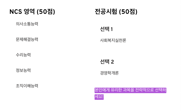 - 전공과목: 사회복지실천론, 경영학개론 중 1과목 선택