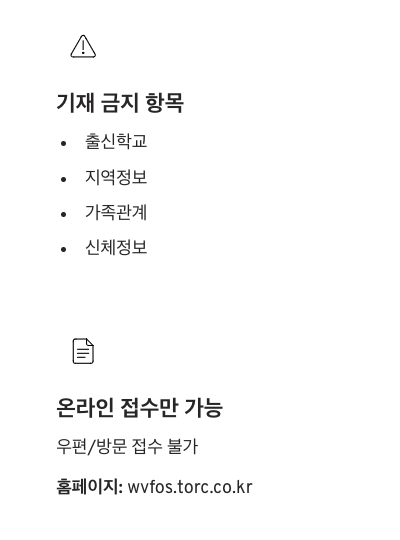 - 접수 방법: 온라인 채용 홈페이지(https://wvfos.torc.co.kr)를 통해서만 가능합니다. 우편이나 방문 접수는 불가하니 미리 사이트에 가입해 두세요!
