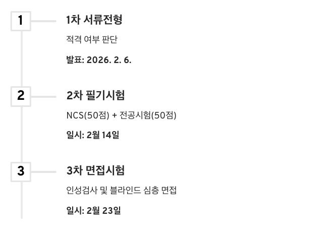 - 2차 필기시험 (2월 14일): NCS(50점) + 전공시험(50점)