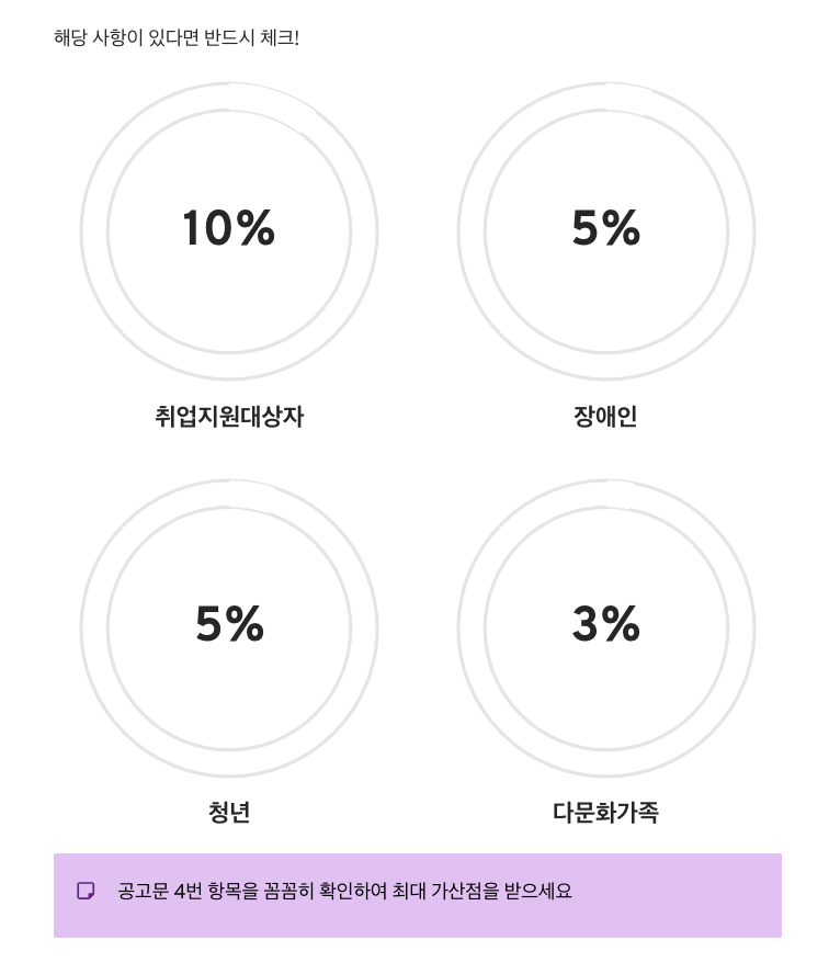 또한, 가산점 항목(취업지원대상자, 장애인, 청년, 다문화가족 등)이 3~10%까지 상당히 큽니다. 본인이 해당 사항이 있는지 공고문 4번 항목을 꼼꼼히 대조해 보시기 바랍니다.