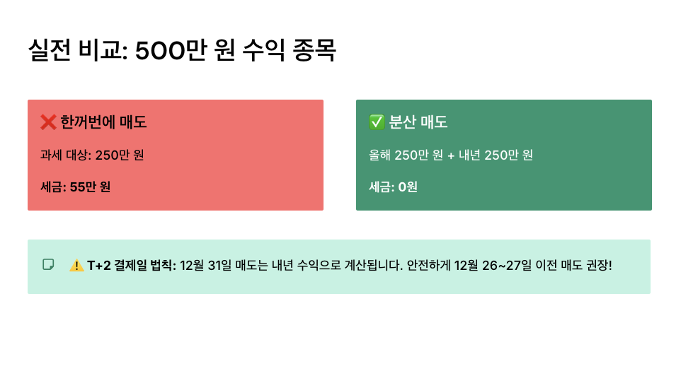 - 올해 250만 원 + 내년 1월 250만 원 분할 매도 시: