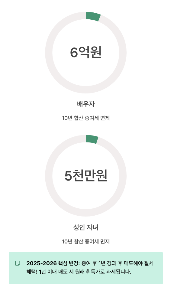 - 2025-2026 핵심 변경점 (이월과세): 과거에는 증여 즉시 매도해도 됐지만, 이제는 증여 후 1년이 지난 뒤에 매도해야 절세 혜택을 온전히 받을 수 있습니다. 1년 이내에 매도하면 증여자의 처음 취득가액으로 세금을 계산하므로 주의가 필요합니다.