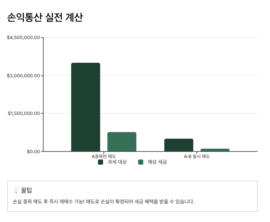 | 구분 | A종목 (수익) | B종목 (손실) | 최종 과세 대상 | 예상 세금 |