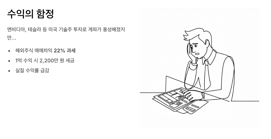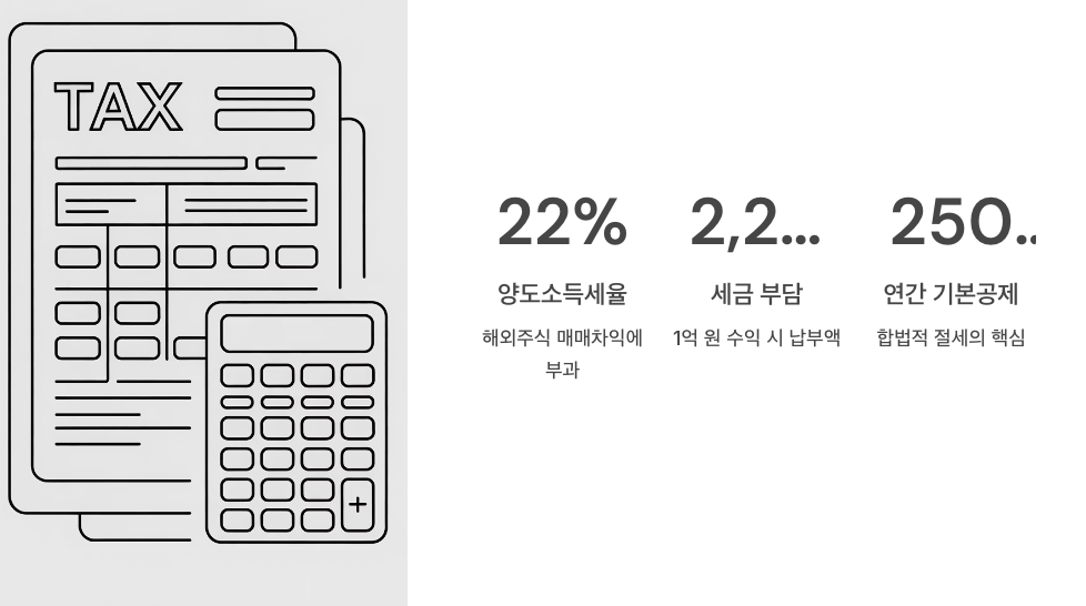 최근 엔비디아, 테슬라 등 미국 기술주들의 기록적인 상승세로 '서학개미' 투자자들의 계좌가 풍성해졌습니다. 하지만 주식 투자에서 가장 위험한 순간은 '수익에 취해 세금을 잊을 때'입니다. 해외주식은 국내주식과 달리 매매차익의 22%를 세금으로 내야 하기 때문이죠.