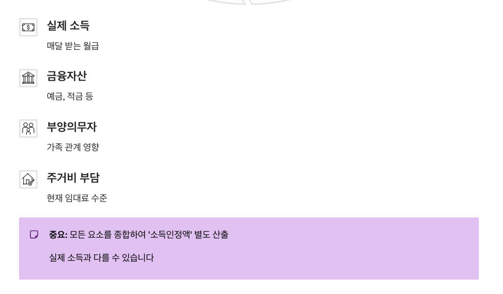 - 주거비 부담 수준: 현재 내고 있는 임대료 등 이 모든 요소를 종합하여 '소득인정액'을 별도로 산출하기 때문에, 실제 소득과 다를 수 있다는 점을 반드시 명심해야 합니다.