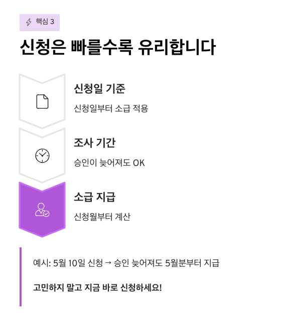 주거급여는 신청일부터 소급하여 적용됩니다. 예를 들어 5월 10일에 신청했다면, 비록 조사가 길어져 나중에 승인되더라도 5월분부터 소급해서 계산되어 지급됩니다. 따라서 고민하는 시간보다 일단 하루라도 빨리 신청하는 것이 금전적으로 유리합니다.
