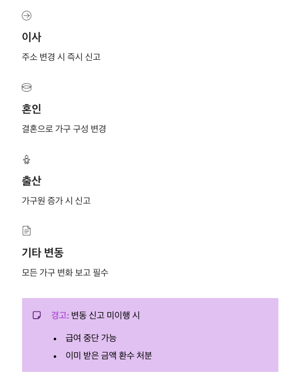 이사, 혼인, 출산 등으로 가구원이 변동되면 반드시 즉시 신고해야 합니다. 이를 게을리할 경우 급여가 중단되거나, 이미 받은 금액을 환수당하는 불이익을 겪을 수 있습니다.